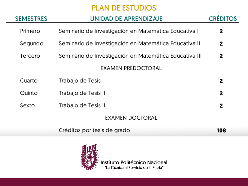 Tener estudios de maestría ya sea en Matemática Educativa o bien en disciplinas afines tales como Matemáticas, Educación, Pedagogía, enseñanza de las ciencias.